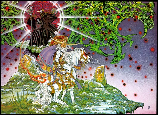 “I HAVE COME FOR THE LIFE OF ONE!” a strange warbling displaced voiced seemed to screech not from the head but from the hip of the rider. -“BUT I WILL TAKE ALL IF YOU DO NOT SEND OUT THE CREATOR!” The figure was tall and seemed abnormally proportioned under a set of tuathan mail. His head and neck were stiff and motionless as if carved from wood and wax to look like that of the former king of the Tuatha; Nuada Airgetlám. The waxen face glinting ominously in the light of the magical flame sword and the torches around him.